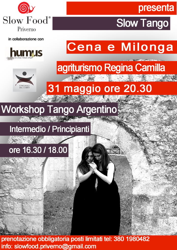 Il 31 Maggio, dalla collaborazione tra Slowfood Priverno, l'Associazione Culturale Humus e il gruppo di Linguaggi del Corpo nasce Slow Tango, una giornata che intreccia un percorso all'interno del Tango Argentino e un percorso di degustazione dei prodotti tipici locali.
