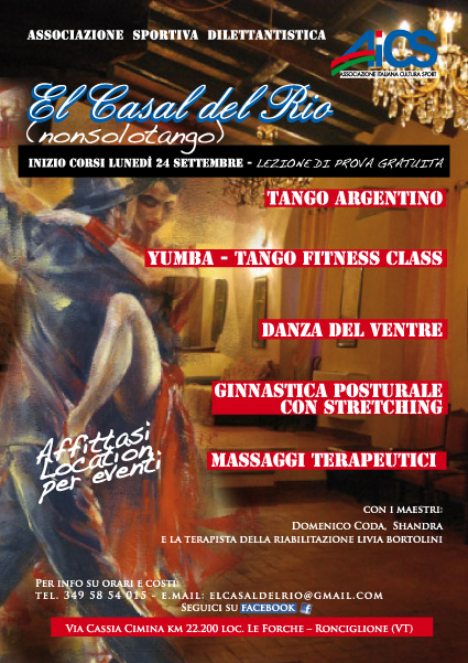Giovedì 4 ottobre 2012 dalle ore 20:00 alle 21:30 presso la sede dell'Associazione sportiva El Casal del Rio, si svolgerà la prima lezione di tango argentino multi-livello GRATUITA con il maestro Domenico Coda