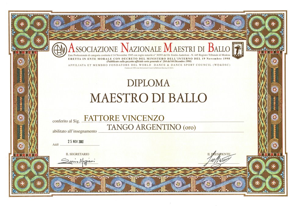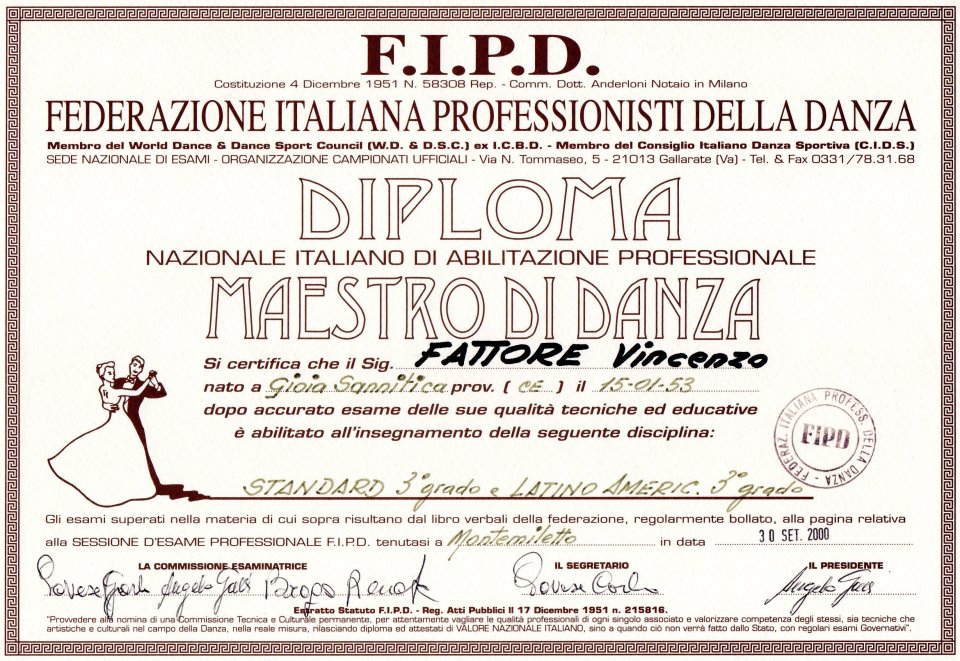 Associazione nazionale maestri di ballo, e federazionie italina professionisti di danza. Nonche' giudice della federazione italiana danza sportiva F.I.D.S.
