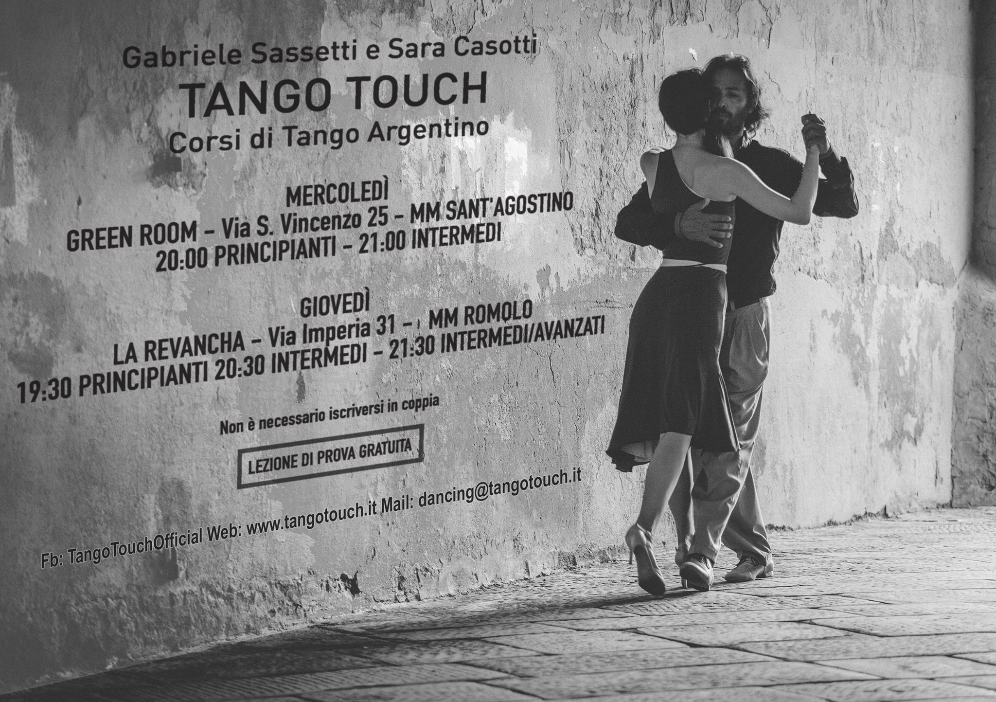 Tango Touch® è un approccio moderno, ricreativo e ricco di suggestioni per iniziare a muovere piacevolmente i primi passi, sperimentare il piacere della complicità e dell’abbraccio, approfondire la musica, la cultura e la ricchezza del Tango Argentino.