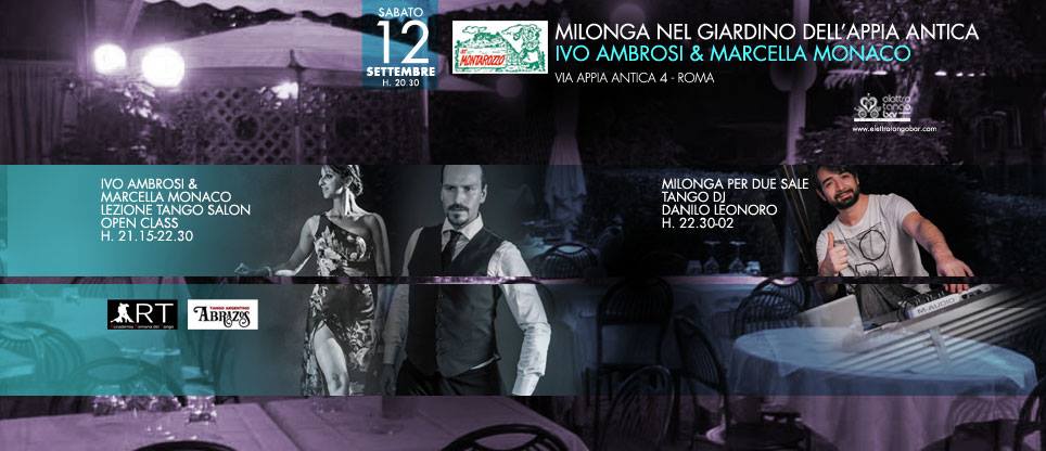 Sabato 12 Settembre Milonga all’Appia Antica al Ristorante Ar Montarozzo: due ingressi e due parcheggi gratuiti Via Appia Antica 4 (Porta San Sebastiano) / Via Cilicia 56 (cavalcavia Marco Polo direzione da San Giovanni). Si balla fuori - nuova pista in legno - e dentro con l‘aria condizionata. Start h20.30 Apericena Tango All Inclusive è consigliata la prenotazione al 3355913434. Sweet Time!
