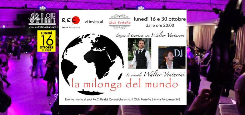Lunedì 16 ottobre Milonga del Mundo con Walter Venturini a partire dalle 20.30 con la Tecnica Applicata al Tango e alle 22.30 Milonga. Info e prenotazioni al 3355913434 – ingresso in lista Patrizia Messina.