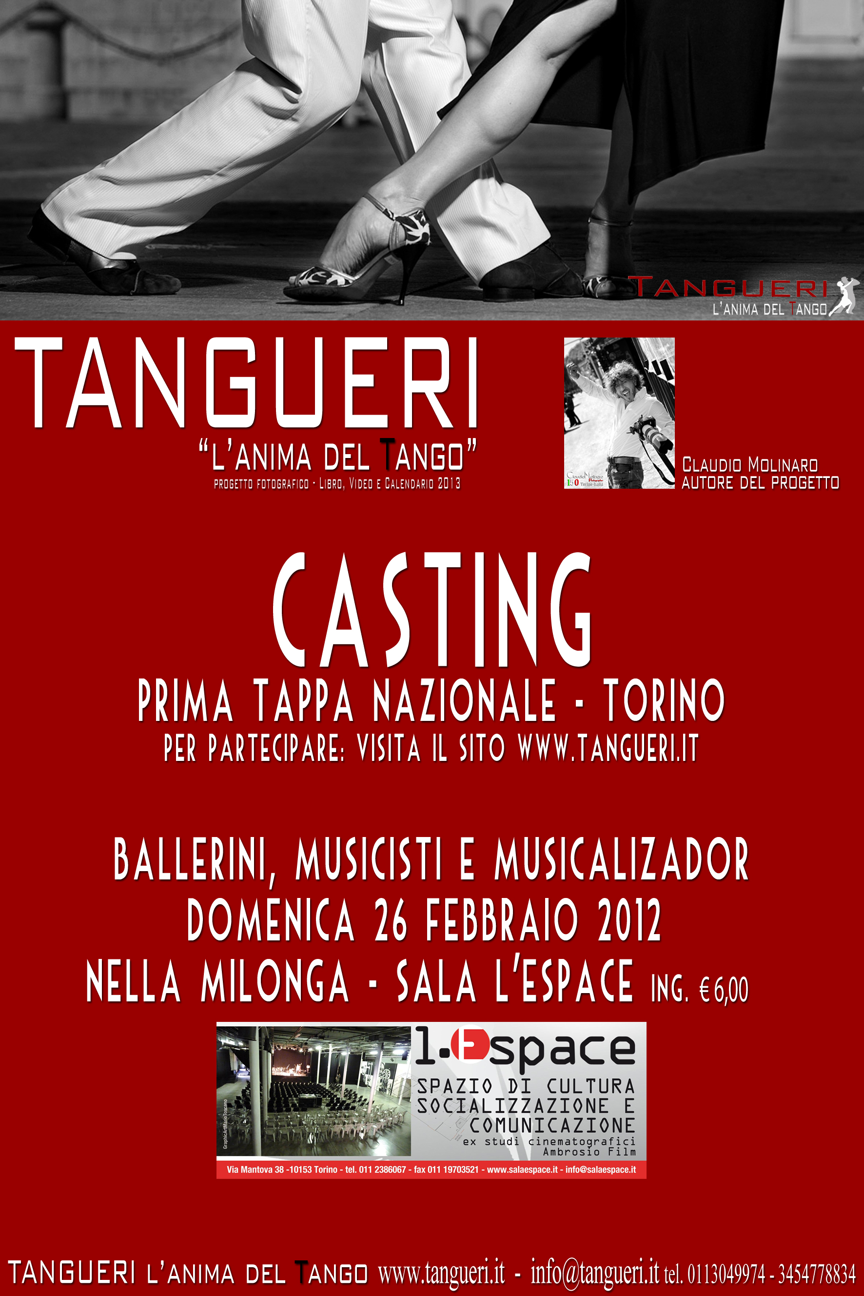 Prima tappa Nazionale del CASTING TANGUERI "l'anima del TANGO" by Claudio Molinaro, libro, video e calendario per l'anno 2013, a TORINO, domenica 26 Febbraio 2011, nella Milonga della Domenica Torinese, inizio dei casting dalle ore 20,00 e si ballerà fino alle ore 2,00