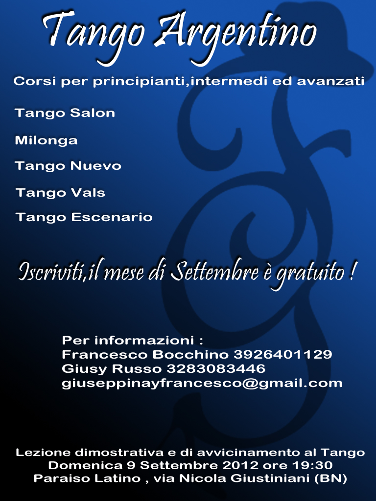 La scuola "Paraiso Latino" di Maurizio Follo per l'anno accademico 2012/2013 offre nuovi corsi di Tango Argentino diretti da Francesco Bocchino e Giusy Russo.