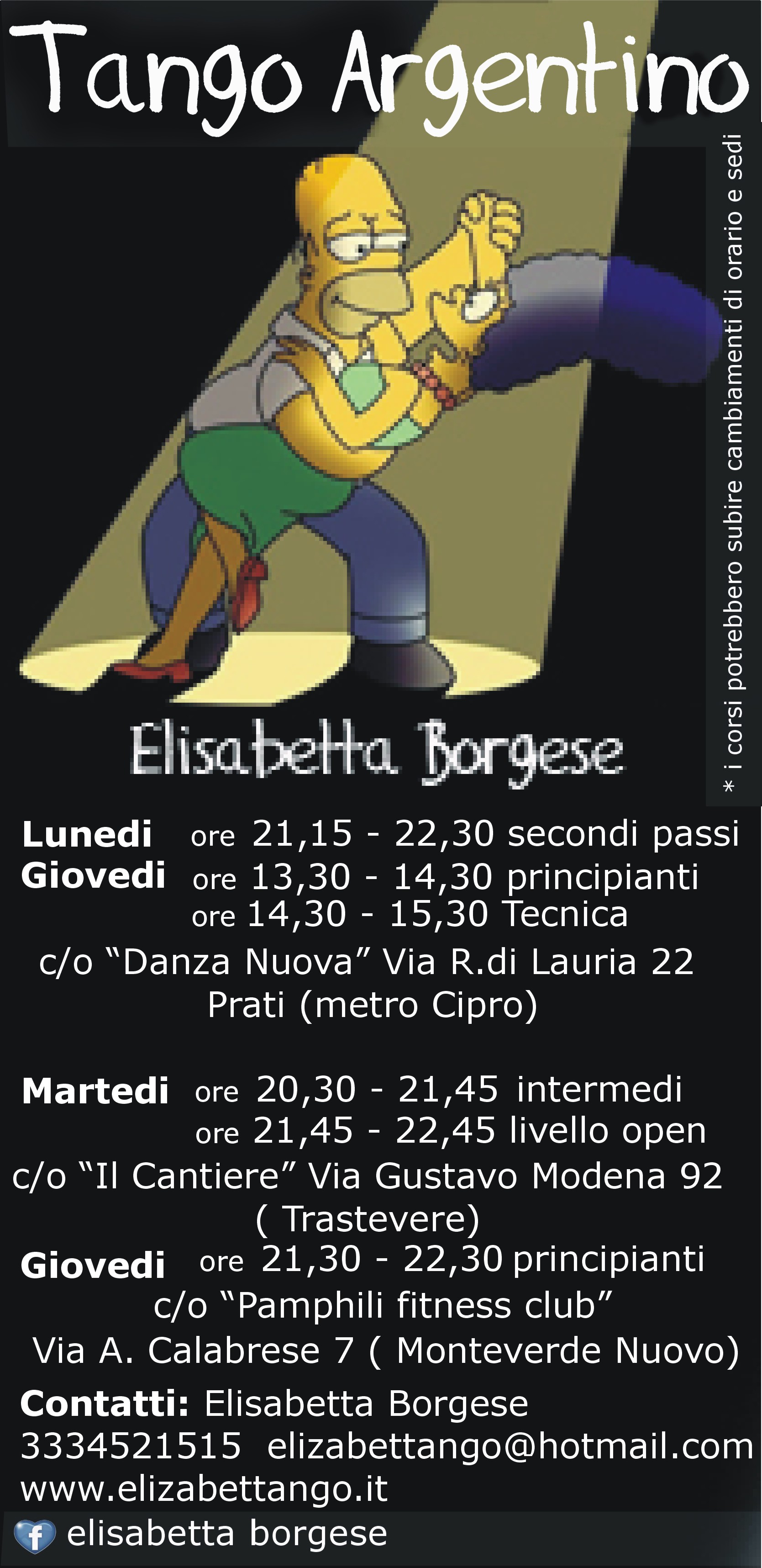 Corso tango argentino con elisabetta borgese presso il cantiere via gustavo modena 92 (trastevere) dalle 20,30 alle 21,45 intermedi dalle 21,45 alle 22,45 livello open